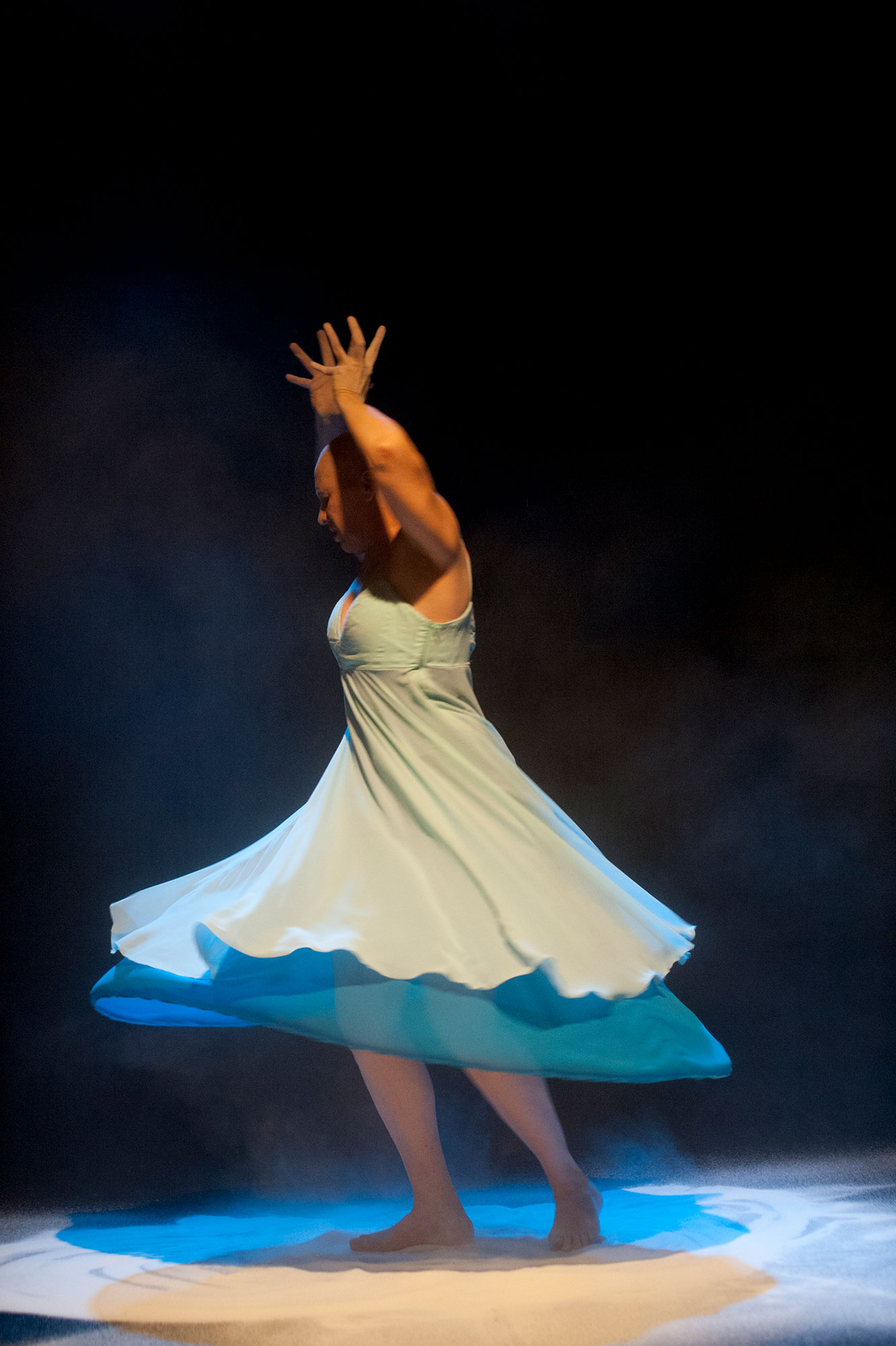 Estou no palco com várias pessoas, dançando. Ou posso estar sozinha. Acontece uma falha de iluminação. O som não entrou na hora certa. Caí no palco. O elemento cênico quebrou ou não está no lugar certo. Nada deu certo. Ficamos perdidos. Transmito insegurança. Como reverter esta situação? O que fazer? Que alternativas tenho? A alternativa é entrar na confusão e submergir.